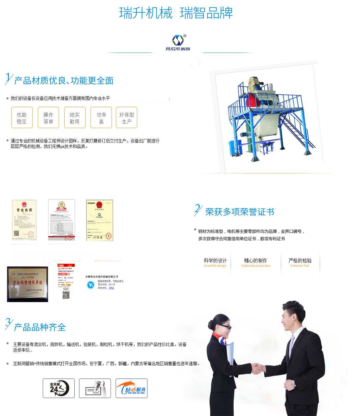 安徽瑞升機械制造有限公司坐落在明光市工業(yè)園區(qū),本公司產(chǎn)品主要用于粉料物質(zhì),顆粒物質(zhì)的混合、攪拌、輸送、包裝的自動化生產(chǎn)設(shè)備。工廠占地面積為1萬多平方現(xiàn)有6000平方米的生產(chǎn)車間和各類加工檢測設(shè)備,具備產(chǎn)品開發(fā)、研制、設(shè)計、生產(chǎn)、試驗、倉儲運輸?shù)饶芰?,可以生產(chǎn)多種規(guī)格、多種非標定制的產(chǎn)品,并有多項技術(shù)獲得國家專利,擁有自主進出口權(quán),公司憑借優(yōu)良的技術(shù)、先進的工藝和科學的管理理念,所生產(chǎn)的產(chǎn)品已暢銷全國各地,部分產(chǎn)品已進入馬耳他、印度尼西亞、韓國、羅馬尼亞、沙特阿拉伯、馬來西亞、印度、巴基斯坦、等國家和地區(qū),受到國內(nèi)外客戶的高度認可和信賴。 本公司獲得守合同重信用單位證書,對原材料的采購極為細致,鋼材為標準型,電機等主要零部件均為品牌,數(shù)項專利證書。技術(shù)方面我司擁有一支國內(nèi)的技術(shù)和管理團隊,在機械設(shè)備應(yīng)用...公司資質(zhì)榮譽